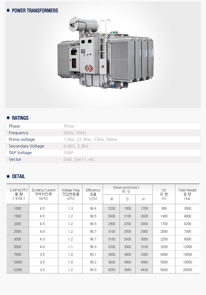 높은 신뢰도가 요구되는 초고압 대용량의 변압기로 특고압을 고압이나 저압으로 강압하여 하위 동력과 배전용 변압기에 전력을 공급하는 주변압기로서 대용량의 설비가 필요한 곳에 주로 사용됩니다.
