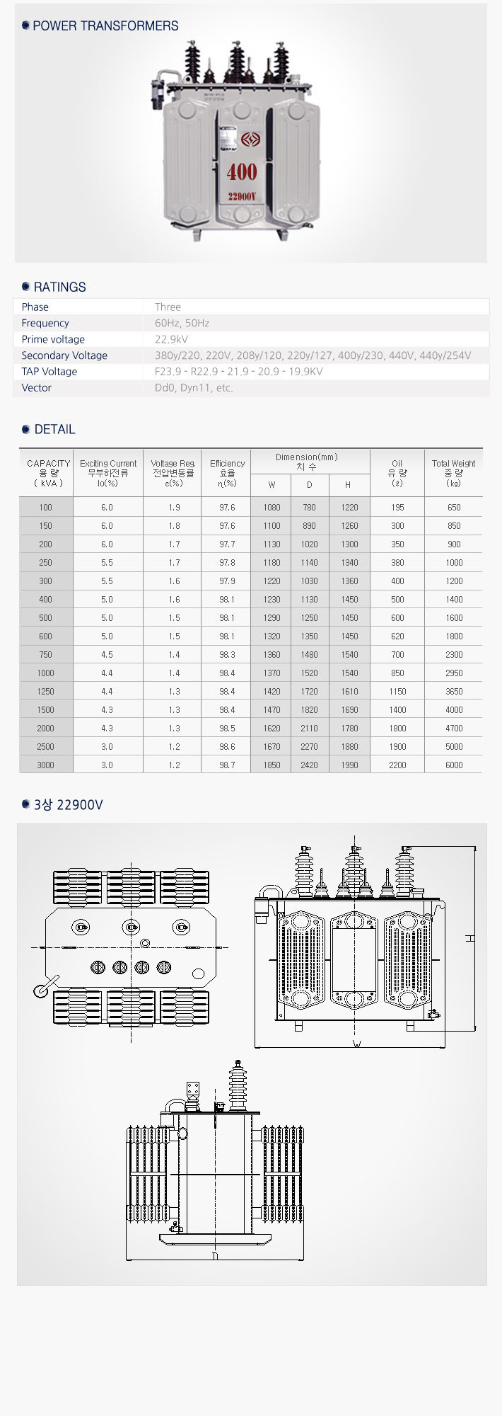배전선로의 고압전력을 공급받아 주로 공장 동력용으로 사용하는 배전변압기로 철심은 경년 변화가 없는 고투자율의 방향성 냉간 압연 규소 강판을 사용하며, 운전 시 징동 및 소음을 극소화 시킨 유입자 냉식 변압기 입니다.