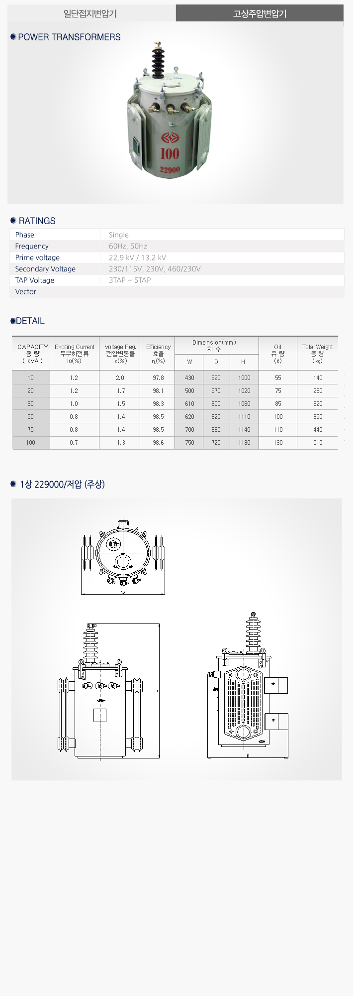 배선선로의 전주상에 주로 설치되는 고효율 저손실의 변압기로써 고압을 수전하여 말단부하에 저압으로 변압하여 소규모 동력 또는 가정 전원용으로 사용합니다.[고압주상변압기]